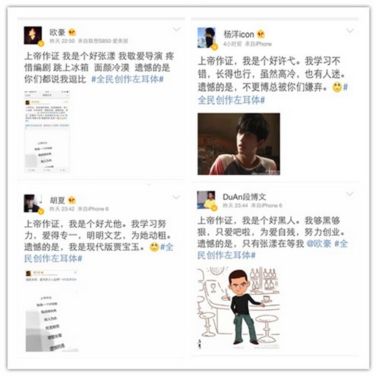 张漾版:“上帝作证,我是个好张漾。我敬爱导演,疼惜编剧,跳上冰箱,面颜冷漠。遗憾的是,你们都说我逗比。”
