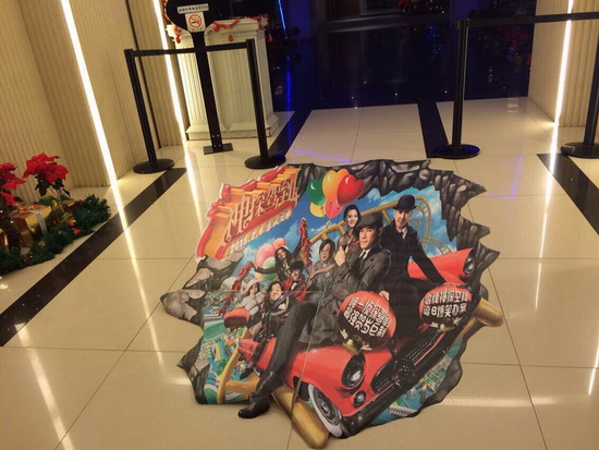 《神探驾到》此次3D地贴的画面选取了概念海报与贺岁版海报作为画面素材,谈到为什么选取这两张海报作为最终在影城与观众互动的地贴时,《神探驾到》的项目负责人王先生谈到,“这两组画面很好地传达出了我们电影的两个卖点,一个是奇幻夸张的故事内容,一个是全明星的贺岁阵容,而这也正是我们想最先传递给观众的影片信息。”