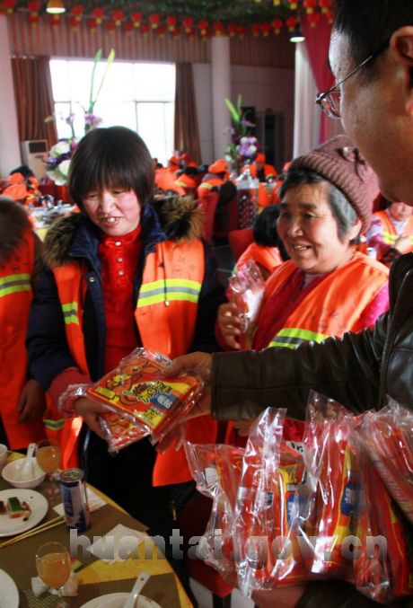 同时,我县多家企业向环卫工人赠送了暖贴等防寒用品。 (李凯 摄)