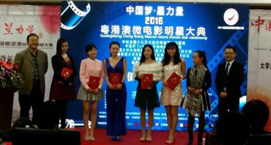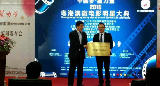 中国微电影明星大典组委会执行主席王永华向参会来宾阐述了中国微电影发展前景,并向粤港澳地区颁发了证书,中国粤港澳微电影明星大典组委会主席吴霄接牌。