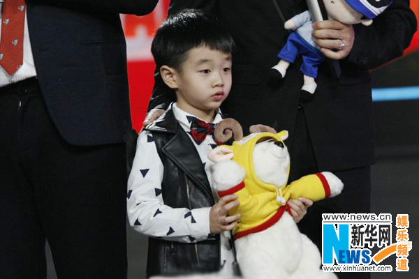 2月12日,世界体操冠军杨威带着儿子杨阳洋亮相2015年湖南卫视春晚,在小年夜给观众提前拜年,并把新春的气氛炒热,现场杨阳洋还给观众送出礼物,一派喜气洋洋。