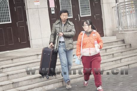 小两口离开了他们的新家。李海亮为了照顾自己的妻子,一个人提起了重重的行李。