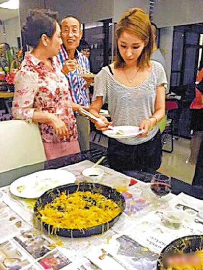 萧亚轩(右)在石家餐桌旁夹取食物