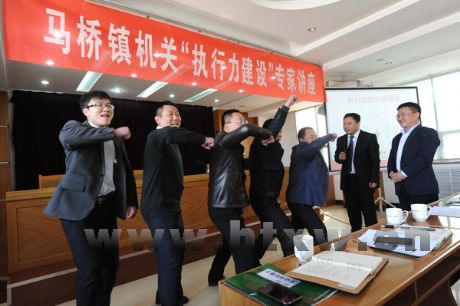 授课中,孙军正语言诙谐幽默,并通过与马桥镇机关工作人员表演与团队执行力有关的互动小节目,极大地调动了工作人员的学习积极性和现场气氛。 (成国栋 李超 张学军 摄)