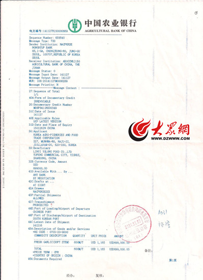 从事外贸近20年的王梅(化名)仔细看过这份由韩方向我国蒜农出具的信用证后发现,其兑付条件非常苛刻,主动权几乎全部在韩方,一旦大蒜被退运,蒜农利益将无法保障。(该照片为信用证的一部分)大众网记者 李兆辉 摄