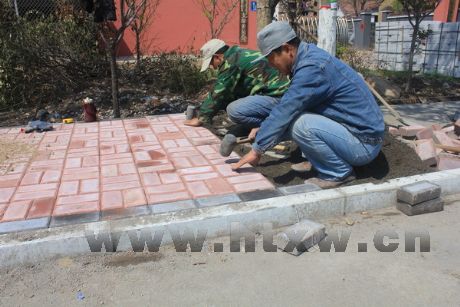 图①为新城镇城南村垃圾池清理现场。图②为荆家镇起马路铺设地砖。图③为索镇东辛村村民清扫村内道路。 (李凯 摄)