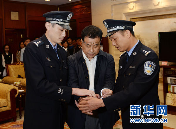 5月9日,在北京首都国际机场,公安干警给李华波(中)戴上手铐。新华社记者 陈晔华 摄