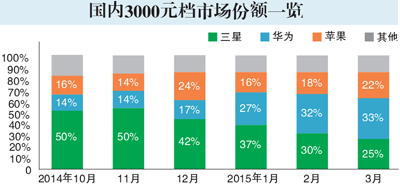 数据显示,在3000-4000元档位国内智能手机市场,三星从去年10月高达50%的份额到今年3月降至25%,而华为和苹果分别占据33%和22%的份额,其他品牌合取其他20%。