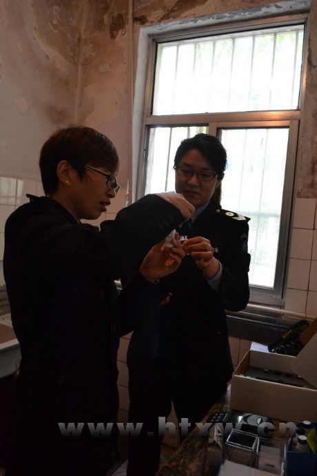 最近,临沂第19中学突发学生集体急性胃肠炎事件,经检测发现,该校饮用水电导率和菌落总数严重超标。针对以上情况,我县组织开展学校饮用水安全专项检查。图为5月6日,县卫生局卫生执法监督所执法人员在淄博建筑工程学校进行水质检测。 (董兆云 刘玉霞 摄)