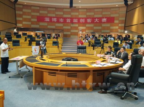 淄博首届创客大赛 图为我县代表正在回答评委提问
