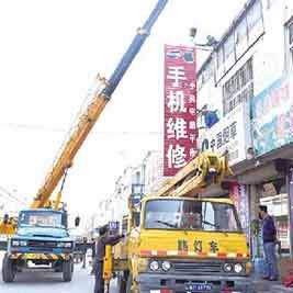 上午10时,记者在批发城看到,这里有洗化批发商铺、手机电脑维修店等,部分店家为了吸引顾客,将两三米高的广告牌设在建筑物二楼,这样的广告牌形状各异、五花八门,不仅影响市容,也存在较大安全隐患。在拆除过程中,工作人员利用机械化设备到达楼顶处,随后在吊车的辅助下利用切割机将广告牌拆除。