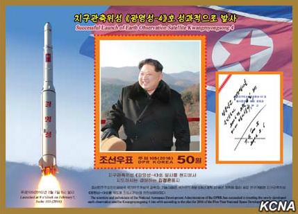 以朝鲜国旗为背景的邮票上,有朝鲜最高领导人金正恩在现场指导“光明星四号”发射的图片和他关于发射卫星的亲笔命令。