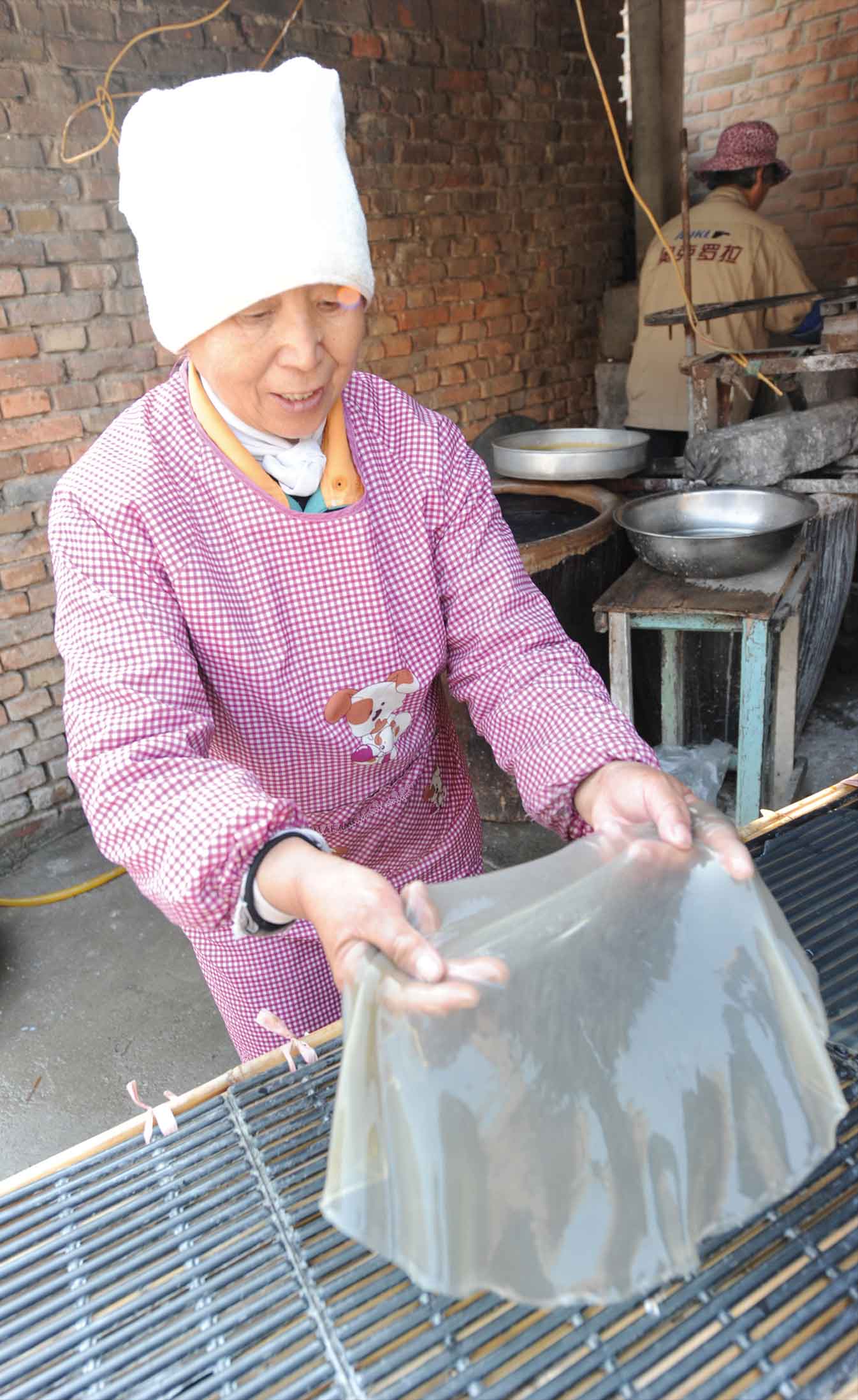 春分时节,起凤镇鱼四村巩志强家的手工粉皮作坊内一派繁忙的景象。虽然传统的粉皮制作已经逐渐被机械生产取代,但是在这里,传统的手工制作粉皮技艺依然在传承着。