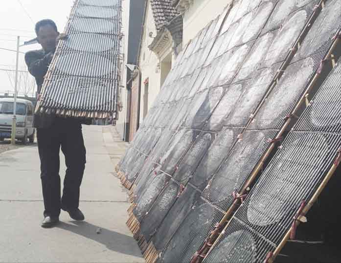 把适量乳白色淀粉糊舀进旋子里,迅速把旋子放到沸腾的锅中,让旋子在热水中旋转起来,把旋子上的淀粉糊转成一个圆圆的形状,再把旋子放进清水里冷却、起皮、拨水,放在高粱帘子上晾晒,经过巩志强的一双巧手,一张粉皮就完成了。从打糊、上锅、起皮、晾晒都是手工制作,这样的粉皮口感筋道,久煮不黏、不碎。“原料都是用自家种的地瓜,不掺别的东西,吃起来放心。”巩志强说,因为是老手艺,纯手工制作,三个人一天最高的产量也不过100斤。但由于质量过硬,巩志强制作的粉皮不用外出销售,客商主动到这里提前下单,到期提货。