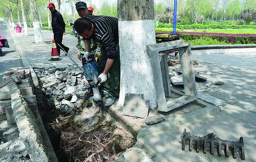 根据现场情况,道路维修队施工人员会同淄博政达监理公司技术人员和县园林局工作人员,共同商讨维修方案。