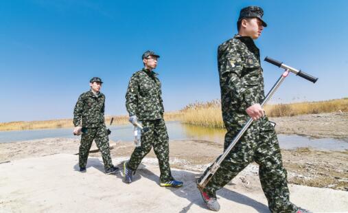 走到新建的湿地体验馆附近,随后而来的挖掘机卷起漫天沙尘,王剑和他的伙伴瞬间被尘土包裹, 两分钟后尘土散去,他们已经登上另一个小山丘,架好望远镜,准备对这块地域进行再一次测量。王剑说,现在的太阳还算温柔,到了夏天,有时候遇到天上没有一丝白云,阳光就直直地照射在地上,那才是真的热得难受,尤其是在芦苇地里,必须穿着长袖长裤,一是为了防止晒伤,二是避免被“凶猛”的蚊虫叮咬,更是防止被芦苇割伤,“最热时地面温度大概有40多度,为了不中暑,就得多喝水,适当注意休息。”多年的经验积累,已经让王剑和他的伙伴们早就习以为常,不过他们说起来很轻松,但回想起刚到单位时,每天的户外作业,一个夏天过去,单位几个比较白净的小伙活脱脱变成了一个个“黑人”,“那时候才是真的觉得累,因为工作还不熟悉,动作慢,自己得和自己较劲。”王剑说。