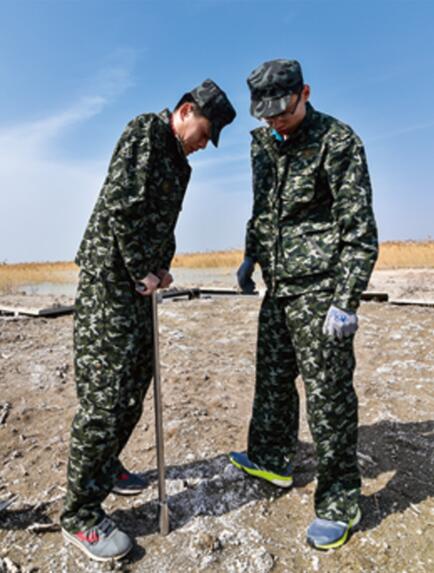 在距离湿地体验馆约2公里处,王剑、宋振鹏、韩冰进行了简单分工,拿上取土钻、工兵锹、密封袋,记录下采样的经纬度和深度,开始对芦苇地进行取土,随后这些土样会被送到专业检测站进行检测,以观察土壤营养元素变化。记者注意到,从芦苇地出来,他们的双脚已经沾满泥土,因为总在外跑,鞋子既要舒适,更要耐脏。