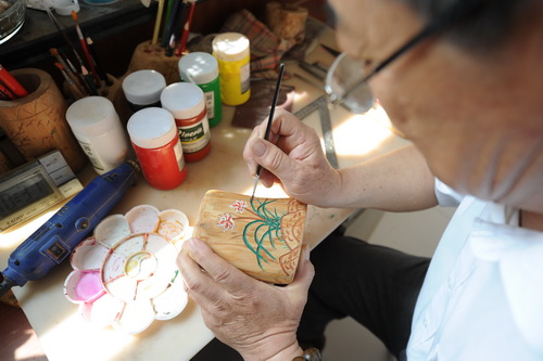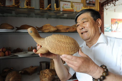 金树光与木之缘来自早年跟随父亲制作木质家具的艰苦生涯,长期的刨、凿、锯、刻虽然辛苦,却使其练就了一身精湛的木工技艺,为其以后的木雕生涯奠定了坚实的基础。在他63岁那年,眼瞅着孩子们都成家立业,慢慢闲下来的金树光便把兴趣盯在了伴随自己大半生的木头上。在浏览了大量的木质制作工艺和成品后,他把精力逐渐专注于木雕技艺上。一开始他只是出于自己的爱好,局限于一只鸟、一个苹果的雕刻上,慢慢地,他的技艺被邻居朋友发现了,今天这个求个木梳,明天那个要串手镯。一年下来,金树光的技艺被周边群众所认可,他的木雕作品开始供不应求……金树光木雕作品的可贵之处首先来自于他对选材的严格上,在技艺日渐成熟后,他选定了稀有的香柏、桃、花椒木作原料。为了一块好木材,他曾南下四川、北往东北。有一次为了求一块好香柏木,他住在南方一座大山6天。功夫不负有心人,经他选中的木材,都质地优良,不裂不张,木质、香气浓郁。金树光木雕作品受欢迎的另一个原因,在于他对这门技艺的精益求精上。传统的木雕一般都是刻好后,在成品外再套上框子,内容只能在边框里面,不能往外延伸,这种工艺使木雕在各个方面都受到限制。在今人看来,这种形式让木雕本身过于厚重,比较呆板。金树光在保留了传统工艺精髓的基础上,创造出了属于自己的雕刻风格,即打破木雕边框高于画面的固有模式,让木雕内容与边框融为一体,并且大胆采用镂空的构图形式,工艺更加细腻,改变了缺乏立体感和远视效果差的弱点,在金树光制作室的墙壁上,挂着他的很多作品:诱人的葡萄挂在枝头,圆润饱满的颗粒让人垂涎欲滴;蔓藤缠绕的葫芦架上,一只鸟立在枝头,让人仿佛能听到它悦耳的鸣叫;华丽绽放的花丛中,一朵朵盛开的牡丹娇艳欲滴,那停在枝叶上的蝴蝶张开美丽的翅膀,仿佛不一会儿就会飞走似的……(摄影报道 成国栋 张学军)