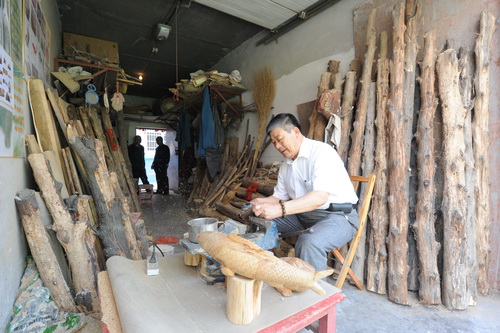 今年65岁的金树光是马桥镇后金村农民。自2014年下半年始,他自学木雕技艺,先后创作了实用、观赏等30余大系列300多件作品,深受周边百姓的喜爱。