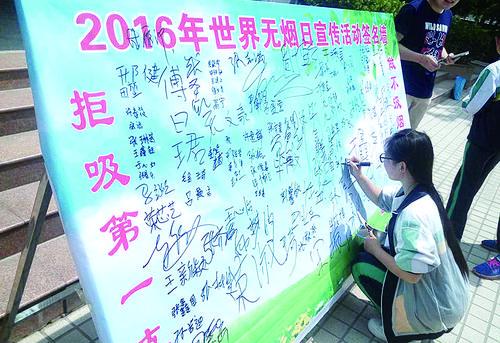 5月30日,唐山镇卫生院公共卫生科工作人员走进唐山中学,组织在校中学生开展“拒吸第一支烟,做不吸烟新一代”签名活动。 ? ? ? ? ? ? ?(张阳 王元芝 摄)