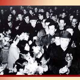 1978年3月,全国科学大会在北京召开。图为少先队员向科学家献花。