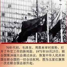 70年代初,毛泽东、周恩来审时度势,打开了外交工作的新局面,1971年10月25日,联合国第26届大会通过决议,恢复中华人民共和国在联合国的一切合法权利,图为五星红旗第一次在联合国总部升起。