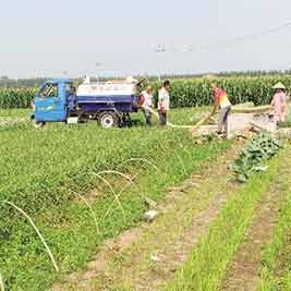 目前,一条“农户+清运公司+蔬菜基地”的生态循环农业产业链日渐成型。图为荆家镇东孙村菜农为韭菜施用旱厕改造后生产的有机肥。