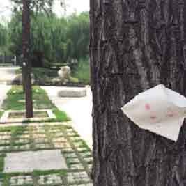 8月21日,记者在红莲湖西湖区看到,公园中几乎每棵树干上都用订书钉固定着一个纸杯,纸杯口全都向下,不知道有什么作用。记者带着问题咨询了红莲湖威海园林公司相关负责人,据介绍,这些纸杯是用来防治美国白蛾的“生物武器”。