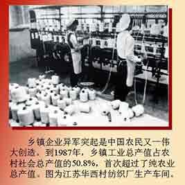 乡镇企业异军突起是中国农民又一伟大创造。到1987年,乡镇工业总产值占农村社会总产值的50.8%,首次超过了纯农业总产值。图为江苏华西村纺织厂生产车间。