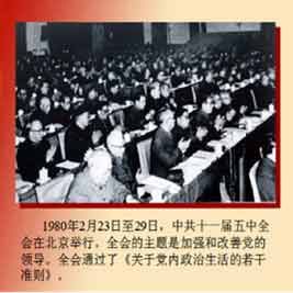1980年2月23日至29日,中共十一届五中全会在北京举行。全会的主题是加强和改善党的领导。全会通过了《关于党内政治生活的若干准则》。