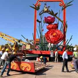 9月19日,工人们在天安门广场安装“祝福祖国”巨型花坛。当日,2016年国庆节天安门广场“祝福祖国”中心主花坛开始吊装。据介绍,花坛高度达17米、篮体高15.3米、直径50米,其内扦插300多枝仿真花,花材以牡丹、玉兰、荷花、月季为主,篮体镶嵌有“祝福祖国”和“欢度国庆”文字及1949至2016的年号,表达对祖国的美好祝福。花坛施工预计周末结束。