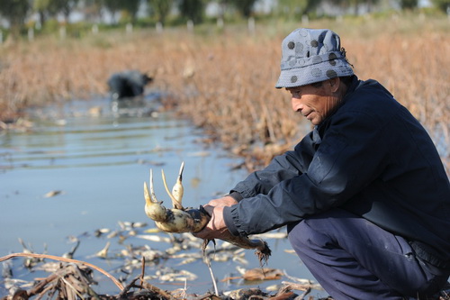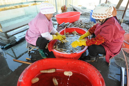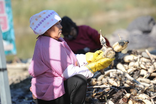 11月6日上午,在马踏湖玉荷苑白莲雪藕基地,61岁的鱼一村村民巩同安正把一捆捆白莲藕搬运上车。他告诉记者,这几天正是村民们制作藕粉的季节,湖区到处可闻藕香。