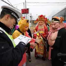 2月7日,河南省济源市207过道上,交警在检查点拦下了“孙大圣”驾驶的一辆大巴车,令人更想不到的是,交警上车后,车上居然还坐着一车“妖魔鬼怪”。在交警询问时,这些“神仙”和“妖精”们围在警察身边,场面甚是滑稽。据了解,他们都是来自济源五龙口庙会的演员,正要下乡去演西游记,没想到刚出门上路就被交警拿住。