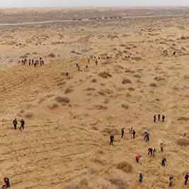 3月12日,人们在甘肃省武威市古浪县参加义务压沙活动。当日是植树节,甘肃省武威市的干部职工来到位于古浪县的腾格里沙漠腹地,开展压沙造林,拉开了该市2017年压沙造林的序幕。