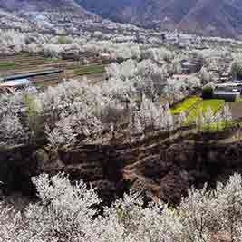 近日,四川省金川县万亩梨花竞相开放,金川河谷两岸漫山遍野的梨花与雪山、麦地、民居等共同描绘出一幅美丽的乡村田园画卷。