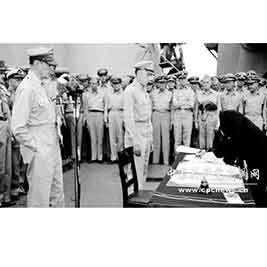 1945年8月15日,日本宣布接受《波茨坦公告》。9月2日,日本在东京美舰密苏里号上签署无条件投降书。图为签字仪式。