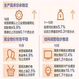 11月14日,国家统计局在国新办发布会上公布10月主要经济数据。从生产需求、就业物价、结构调整等方面的数据来看,10月份国民经济运行在合理区间,保持总体平稳、稳中有进的发展态势。