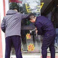 为进一步推进城市精细化管理,连日来,县综合行政执法局对城区内的破损广告、墙体广告、橱窗乱贴乱画、违规广告牌匾、乱扯的条幅等进行了全面的清理整治。图为执法人员帮助清理金太洋小区附近门店玻璃上的宣传大字。
