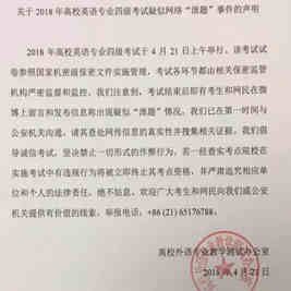 英语专四考试被指泄题,组织方高校外语专业教学测试办公室发布声明称,已向公安机关反映情况,考生和网友可向办公室提供线索。