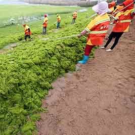 6月18日,山东青岛相关部门组织6台大型工程机械、40多名工人在团岛湾对浒苔进行清理。