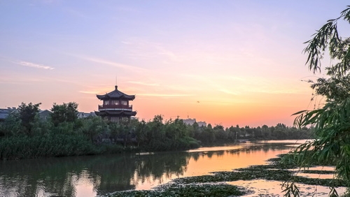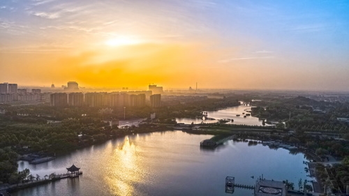 5月24日清晨,红莲湖薄雾弥漫,朝霞似锦倾泻在平静的水面上,一派迷人美景,令人沉醉其中。晨光无限好,尽在红莲湖。(摄影报道/ 《桓台大众》全景航拍队 于洋)