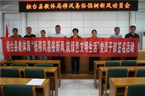 县教体局机关全体工作人员参加会议,签订了《桓台县教体局局移风易俗承诺书》,并在“扬移风易俗新风 筑绿色文明生活”横幅上签名留念。