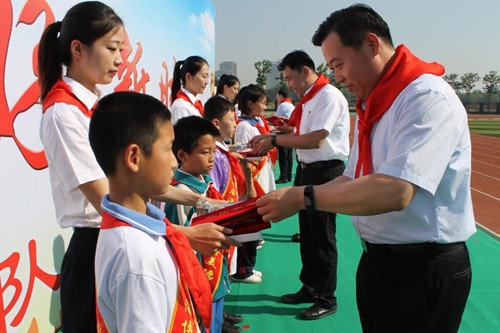 活动现场为第四届“淄博美德少年”颁奖,并为“小小志愿者服务队”授旗。来自于唐山中学的第四届“淄博美德少年”代表于俪洪号召全市少先队员要拥抱新时代、牢记新要求、学习好榜样,争做新时代好队员。