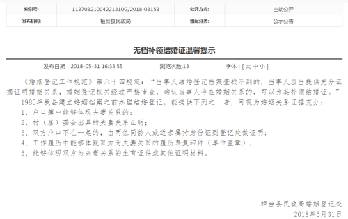 按照省政府办公厅关于解决群众办事堵点难点问题的相关要求,桓台县民政局婚姻登记处迅速采取措施,购置复印机,严格按规定不再要求办事人员提交证件证明复印件,而是由工作人员审核原件后自行复印存档,以提升群众满意度。同时按照省政府办公厅关于清理村(社区)出具证明材料的相关要求,对申请补证的无档人员,婚姻登记处及时调整思路,不再把村(社区)证明做为能够证明其婚姻关系的唯一证据,而是提供了几个选项让当事人根据自己的实际情况自由选择提供证据的方式,从而为当事人提供方便,妥善解决工作中遇到的难点问题。