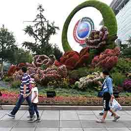 8月28日,行人从北京西单的“繁花似锦”花坛前走过。2018年中非合作论坛北京峰会将于9月3日至4日在北京举行。据了解,峰会景观布置现已全部到位,大部分花坛花卉将一直沿用至国庆。