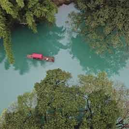 9月12日,游客在大小井风景区乘竹筏游玩(无人机拍摄)。近日,贵州省罗甸县大小井风景区秋意渐浓,吸引游客前来游玩。