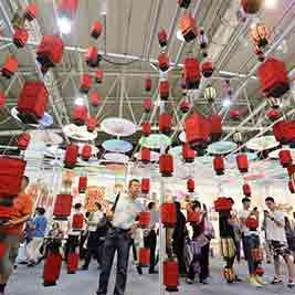 9月13日,在济南舜耕国际会展中心,市民欣赏丰宁满族灯彩。当日,为期五天的第五届中国非物质文化遗产博览会在济南开幕,主会场设在济南舜耕国际会展中心,共有500多种非物质文化遗产项目参展,分为织绣印染、陶冶烧造、编织轧制、制茶酿造、印刷刻绘、家具文房、中药炮制、雕刻塑造八个主题,吸引众多市民前来感受非遗文化。