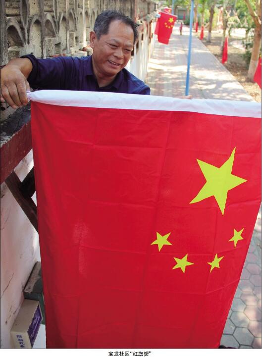 9月27日,在国庆节来临之际,记者在城区街道宝发社区采访时看到,居民和部分商铺将一面面国旗悬挂在自家门前,表达了爱国热情,也为城市增添浓厚的节日氛围。