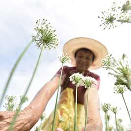 9月5日,在山东省聊城市茌平县贾寨镇韭菜地里,村民在采摘韭花。