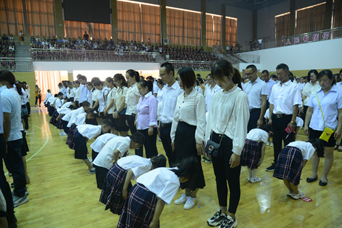 《礼记》有云:“礼义之始,在于正容体,齐颜色,顺辞令。”在主持人口令下,全体同学进行正衣冠。额点朱砂,萌娃开智。参会嘉宾和各班老师用朱砂在每一位同学额头正中点红痣,一颗颗红痣饱含着父母、老师、学校的美好祝愿。笔墨纸砚,文房四宝。为每位新生赠送一只毛笔,愿同学们努力学习,传承中华文化。全体同学向老师鞠躬行礼,感谢老师教导之恩,向父母鞠躬行礼,感谢父母养育之恩。同学面对面,互相鞠躬行礼,感谢同学一路相伴。同学们举起右手握拳,庄严宣誓:学习先贤,传承文化;好好学习,天天向上;全面发展,健康成长!一年级级部主任荆洋作为教师代表,上台宣誓:静心教书,用心育人,惟志惟勤,日进日新;努力用敬业、博学、儒雅成就每一个学生,在最美的校园里,做最真的教育,让每一个生命更精彩!